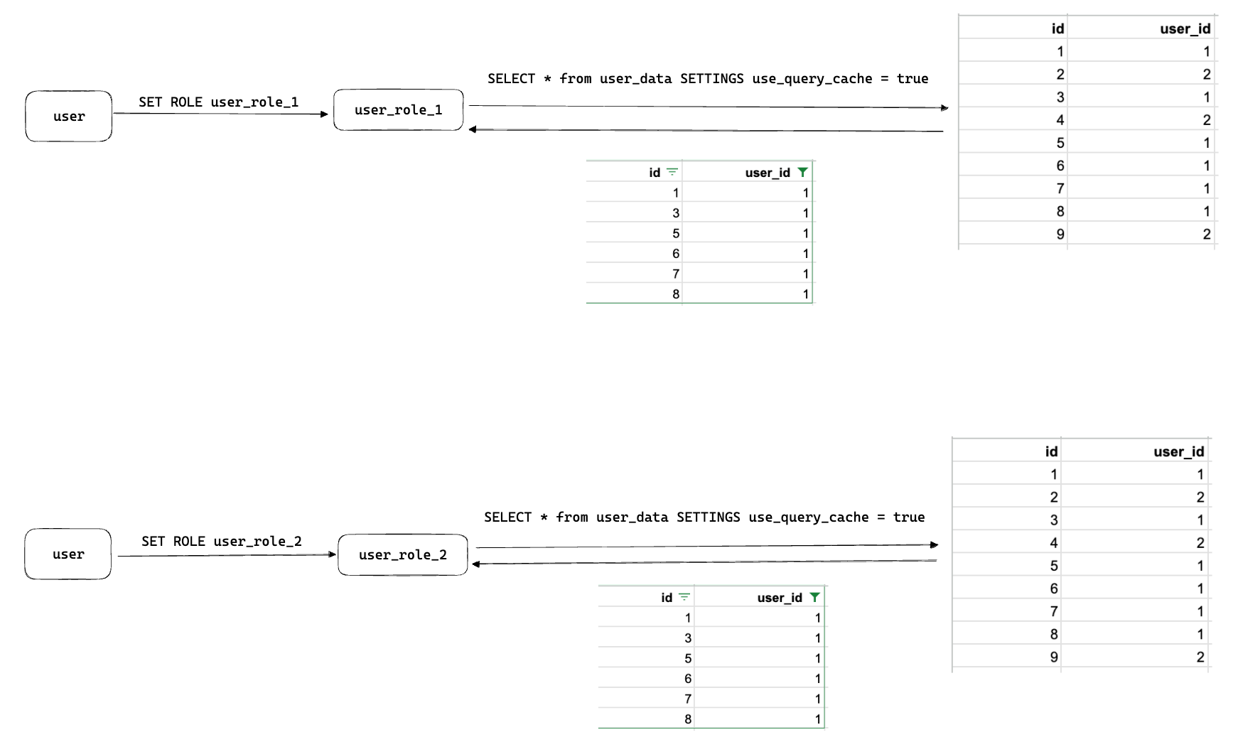 But since user_name is just the user string from above we run into the obvious question of what happens when the same user, using different roles, queries using the query cache. If the query existed in the query cache then user_role_2 might get someone else's data!