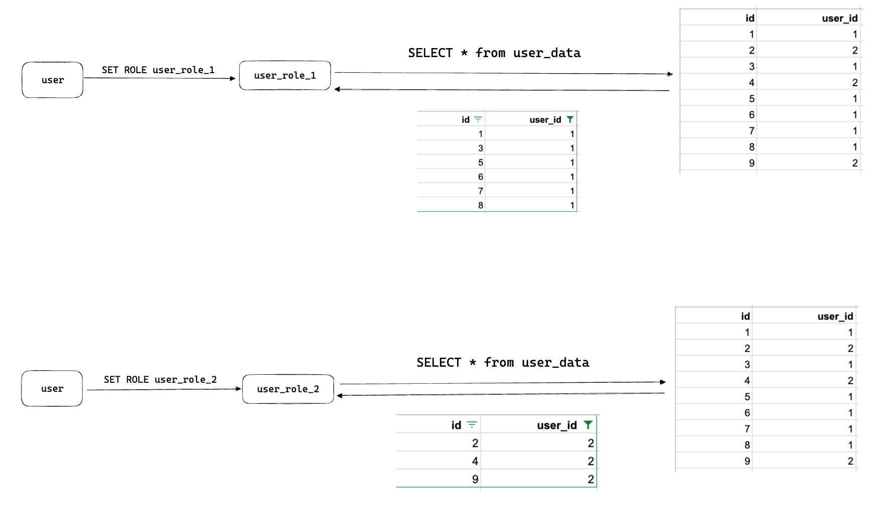 Once setting this up, the policies for user_role_1 or user_role_2 will allow each role to query the user_data table and only see the data with the corresponding user_id from their row policy.