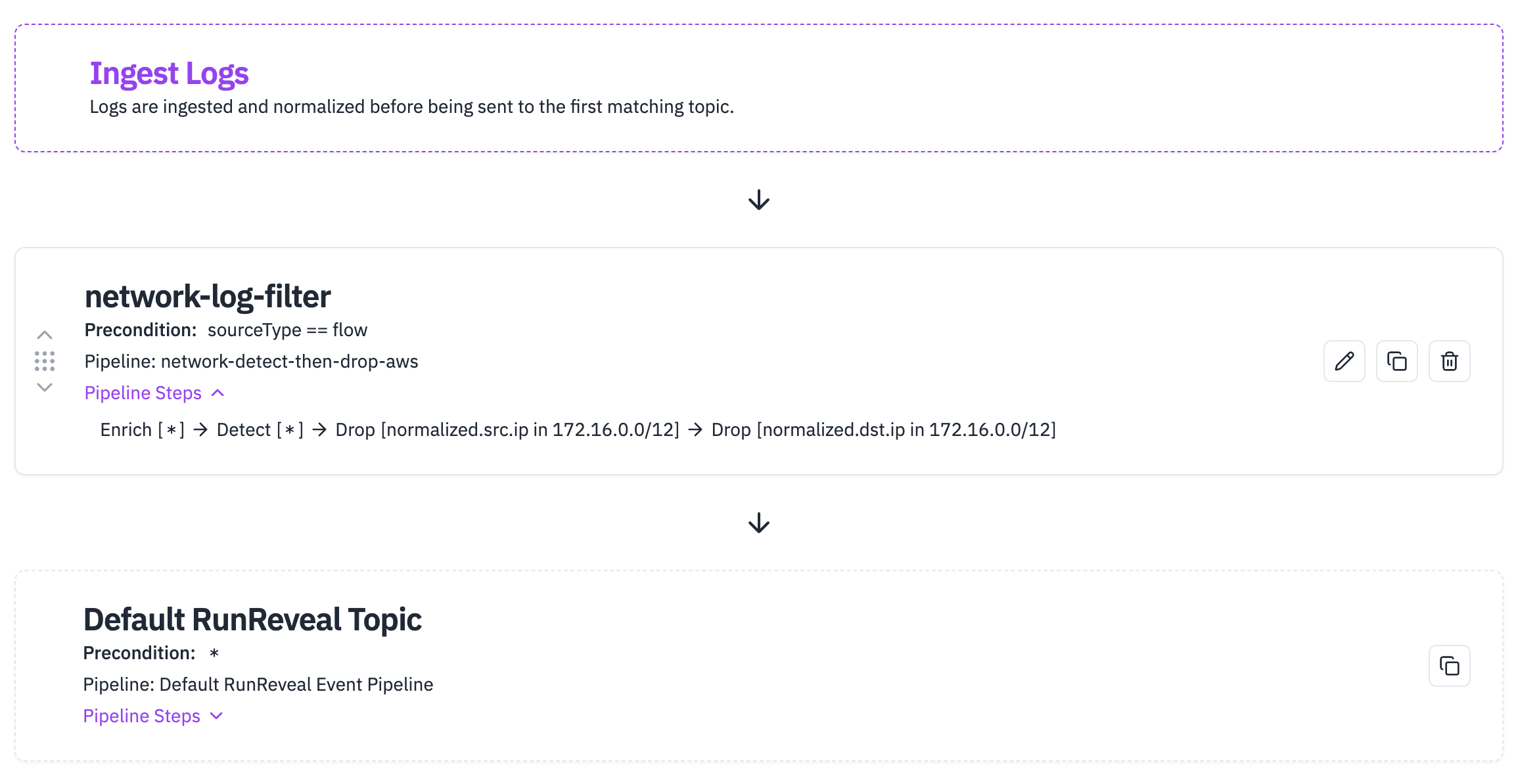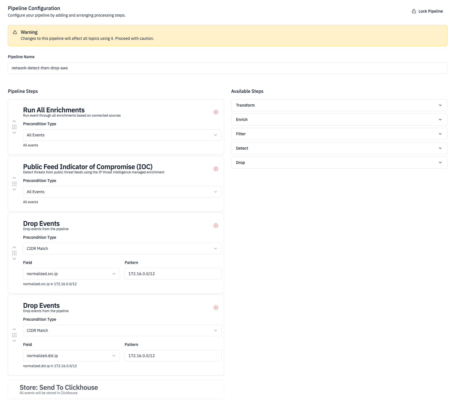 To make this kind of pipeline we configured our enrichments, detections that we wanted to run, and then decided to drop all logs where the srcIP or dstIP is in the CIDR 172.166.0.0/12. We are able to build this out quickly by drag and dropping the few steps we have into the order we want.