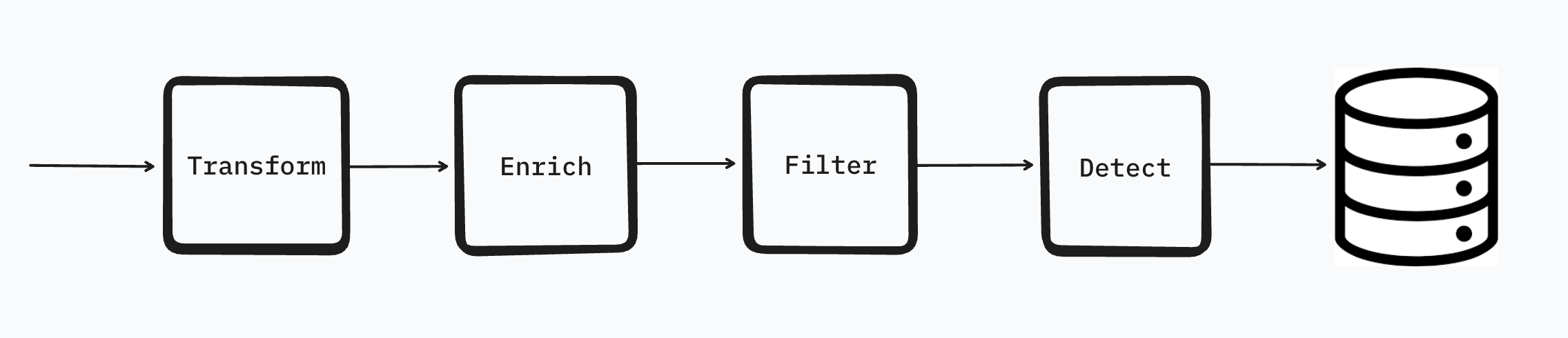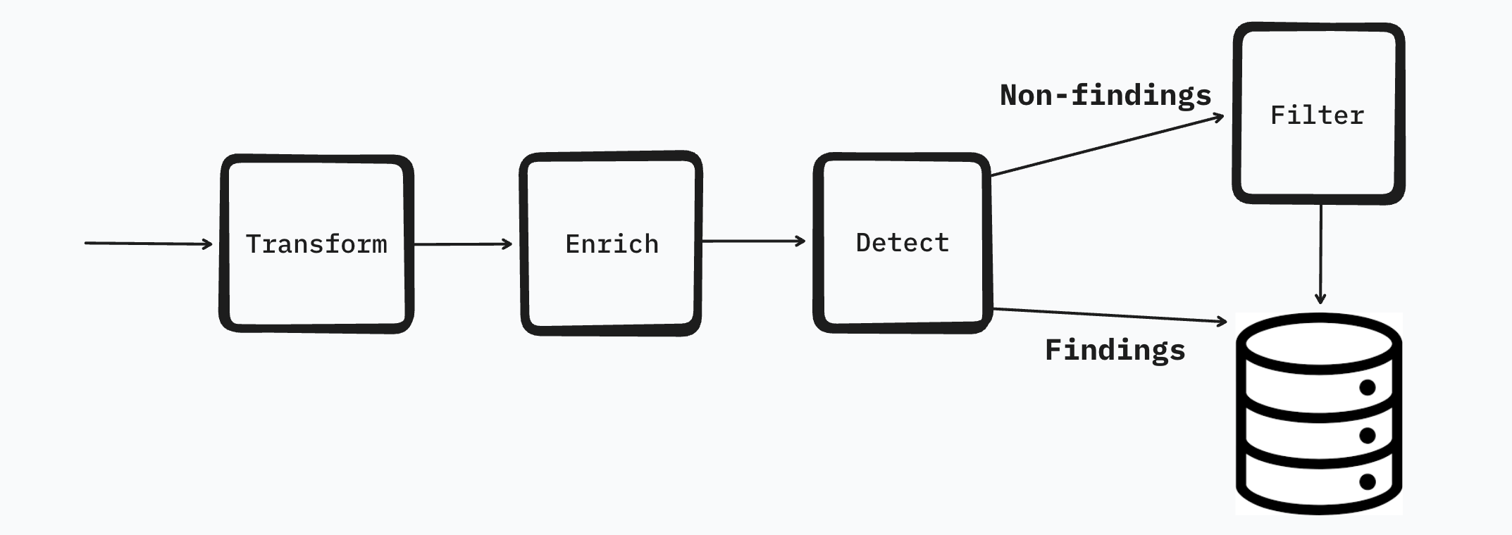 The default RunReveal processing pipeline will transform, enrich, filter, detect, and then finally store all of your logs. It's also worth noting that we store all logs that match a detection as a finding, regardless of filtering.
