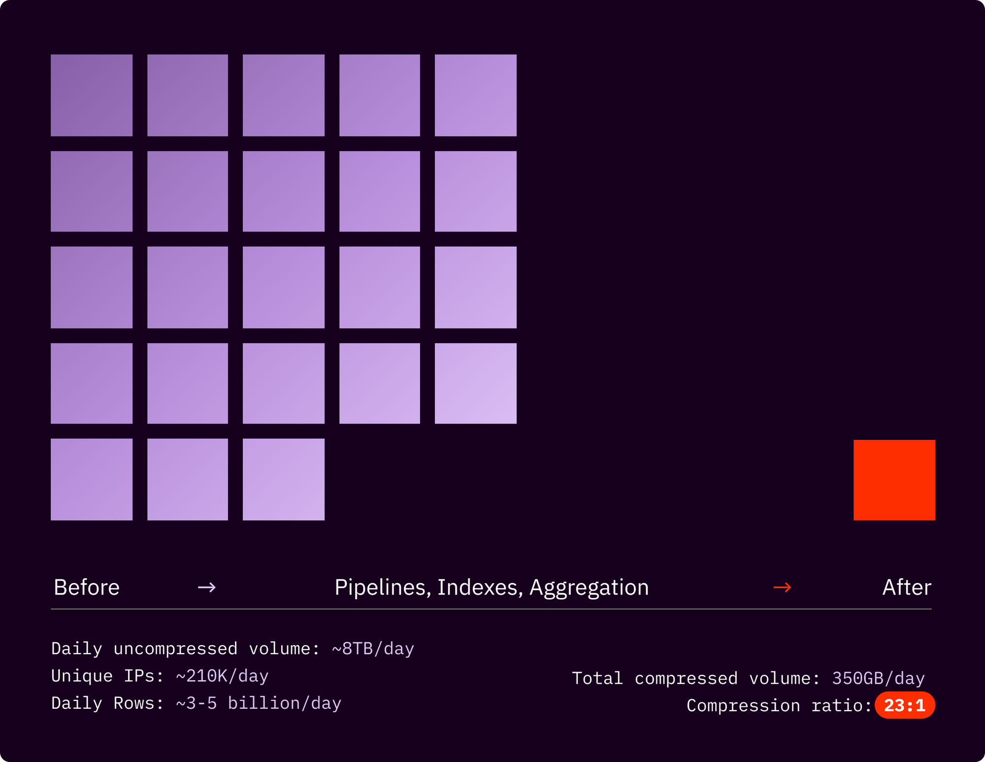 The results were immediate. Queries that used to time out now return in seconds. The ~8 TB of daily raw data compresses down to ~350 GB without losing the fidelity the team needs for investigation. Complex detection logic that was previously impractical to run continuously now runs in real time.